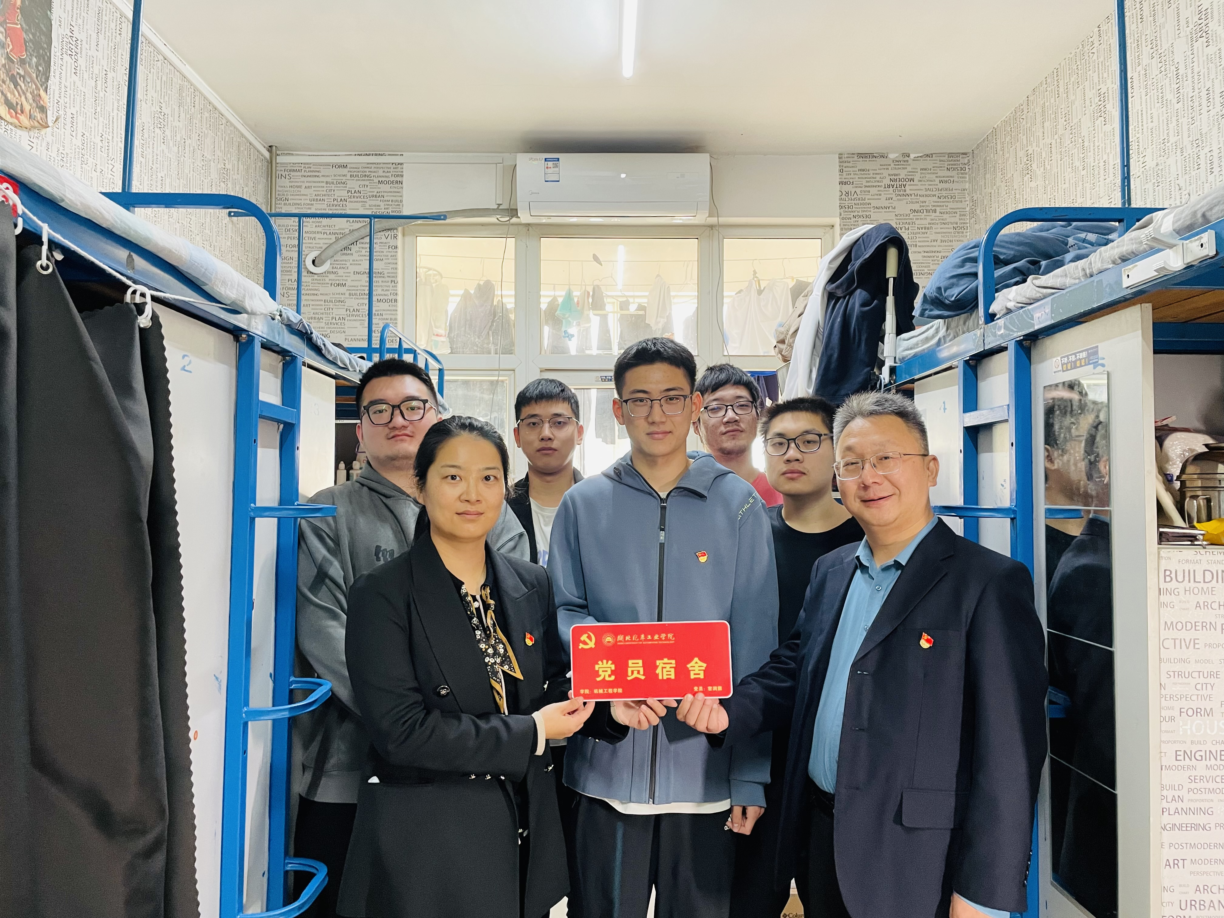 党员挂牌亮身份,先锋模范做表率。 亮身份,明责任,做标杆,机械工程学院学生党支部以学生党员为标杆,以学生寝室为载体,以寝室建设为抓手,将组织育人与寝室管理工作相结合,打造“党员寝室示范工程”。在党员寝室挂牌,以党员为典型示范,打造思想积极、目标清晰、风清气正、卫生优秀、习惯良好的标杆寝室,实行学生党员结对帮扶制,依照小组内学生党员各自的特长,有针对性地对楼栋内的困难学生进行结对帮扶。强化学生党员服务意识,推广“有困难、找党员”工作承诺,帮助楼栋学生协调和解决各类困难,让党员学生做到平常时候看得出来、关键时刻站得出来、危急关头豁得出来。