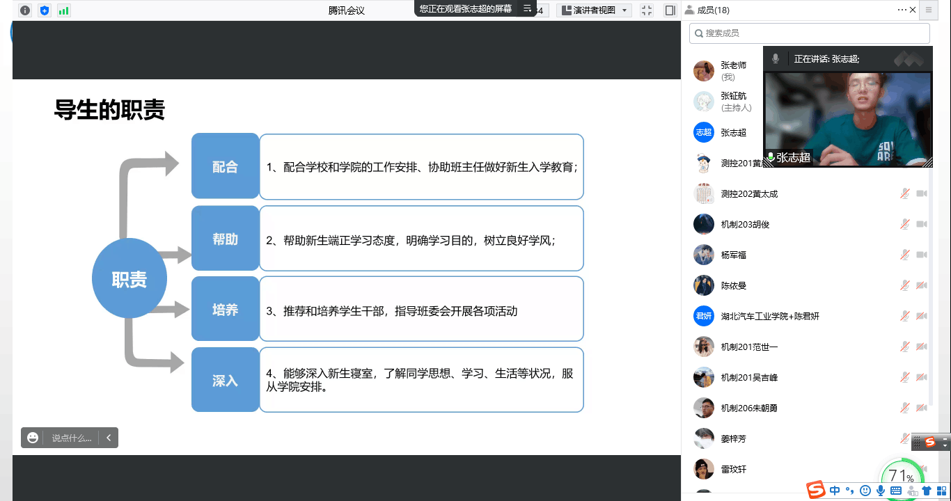 会上,张志超首先就什么是导生、导生的职责、怎样做好导生、对导生的理解四个方面展开分享,明确了导生肩负的责任和承担的工作,他指出“导生是新生在大学接触到的第一人,是大一新生入学最可靠的伙伴”,必须用心、耐心、尽心、真心做好新生一切工作,并围绕导生迎新工作、常规工作和特色工作展开详细介绍,同时分享了上一届导生以及自己作为导生的优秀做法,并向新生导生提供了相关建议参考。接着,张志超强调了迎新工作及新生入学教育的重要性,并根据往年迎新工作遇到的各种问题讲解注意事项,从新生入学报道流程、入学班会、心理团辅等方面分享经验,鼓励导生们既要传承优秀工作模式也要结合新生特点创新工作方法引领新生们成长成才。