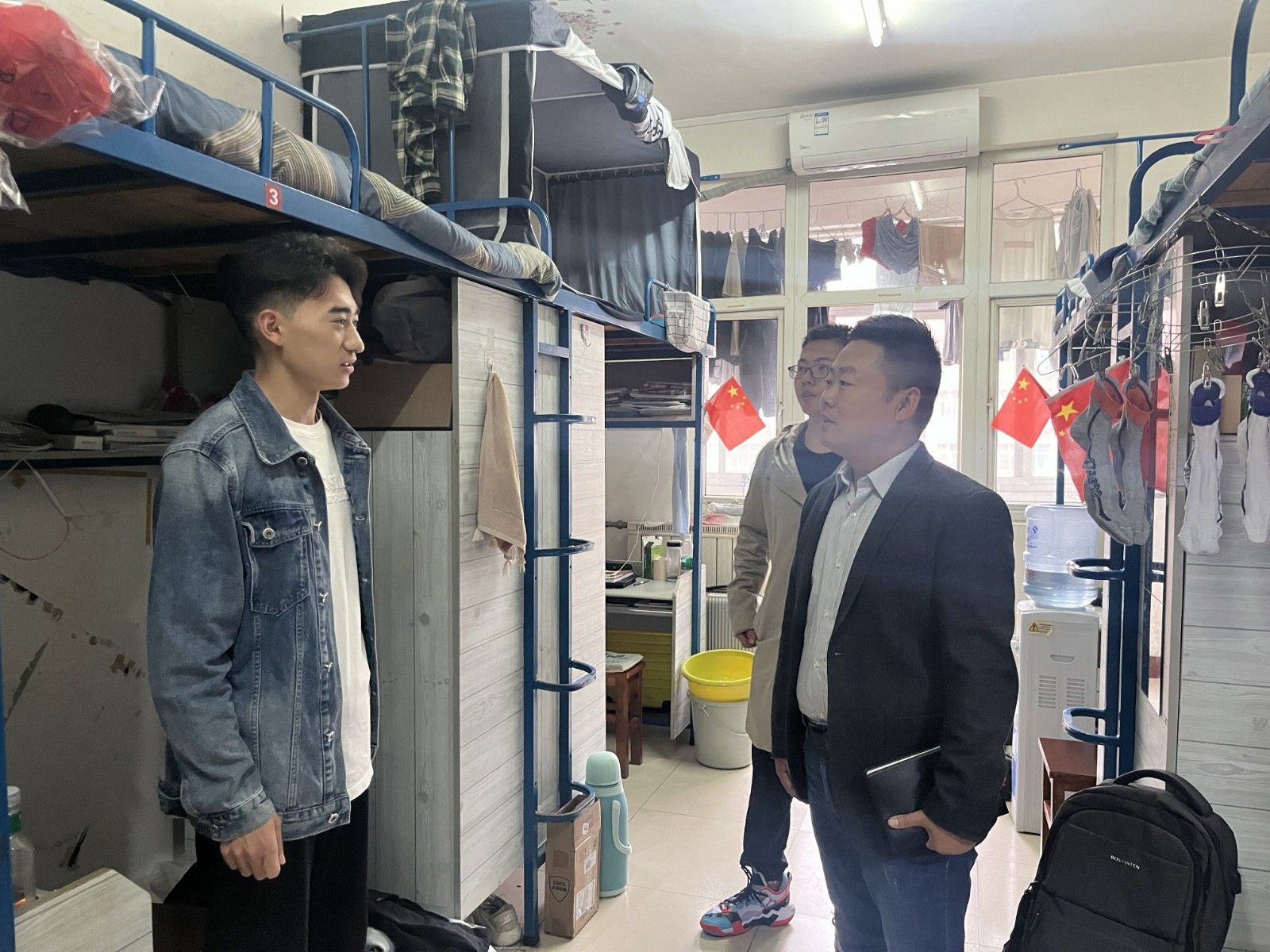 走访检查过程中,马晓涛十分关心同学们的住宿安全和日常生活问题,与同学们亲切交谈,了解同学们的学习和宿舍生活情况。郭建峰同宿舍管理员进行交流,检查宿舍楼内所采取的安全、服务管理措施,叮嘱大家一定要遵守《学生宿舍管理规定》,提高安全防范意识,注意安全用电。