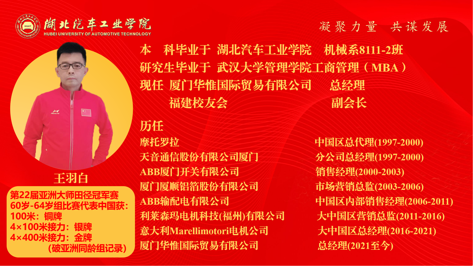王羽白校友,现任学校厦门华惟国际贸易有限公司总经理、福建校友会副会长,2023年代表中国参加第22届亚洲大师田径冠军赛,获得60-64岁组比赛100米铜牌、4×100米接力银牌、4×400米接力金牌(破纪录)。多年来一直关注支持学校发展,在参加学校第三次校友代表大会换届大会期间,关心学弟学妹的成长发展,主动请缨为学院学习学妹传授职业生涯规划、发展经验,助力学弟学妹成长成才。