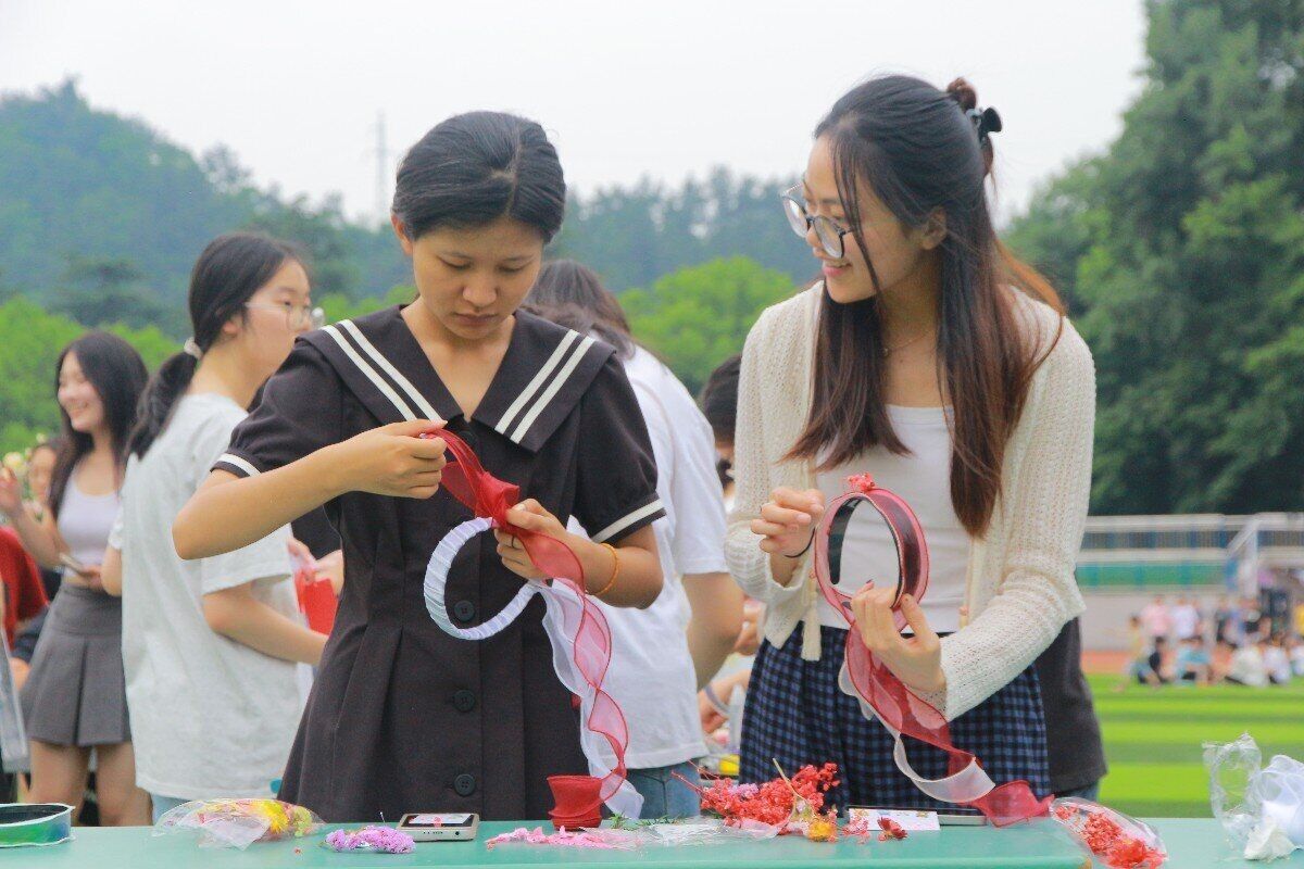 手工簪花,体会人生旅途之“美”。伴随着回旋舞社的开场舞《Forever Young》活动正式拉开帷幕。律动的音符、动感的舞姿和同学们的欢声笑语与傍晚时分的晚霞交相呼应,在田径场上形成了一道靓丽的风景线。在第一板块“人生如花”的活动中,同学们各自挑选心仪的发簪样式,充分发挥自己的想象能力,运用缠绕、组合、胶粘等技巧将各种材料和配饰巧妙的搭配在一起,制作出别具风韵的簪花作品。通过制作簪花作品的过程,让同学们感受手工制作的魅力,并舒缓情绪、放松心情。同时,也让同学们在手工簪花的过程中通过饰品体会文化传承之“美”和人生旅途之“美”。