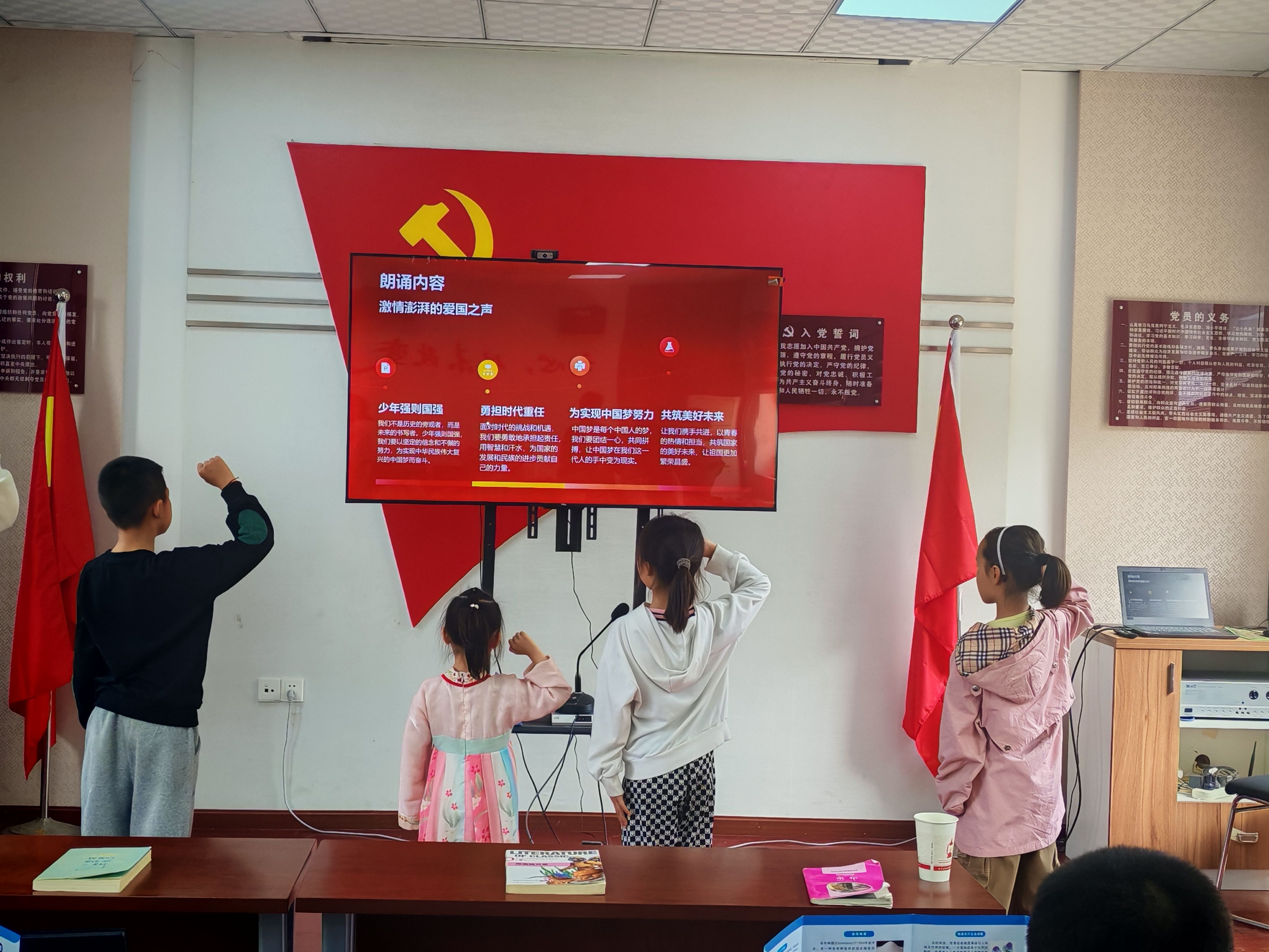 最后,活动在《少年中国说》的齐声朗诵中落下帷幕。青年志愿者与参加活动的青少年们共同发出倡议,一是铭记少年强则国强,做未来的书写者;二是担起强国复兴的责任,做发展的贡献者;三是彰显青少年奋斗本色,做中国梦的追梦者。张静怡小朋友说“老师,强国复兴有我!朱海秀姐姐、赵鹏菲姐姐她们都是我的榜样,我会好好学习,长大后像他们一样,为祖国贡献自己的力量。”
