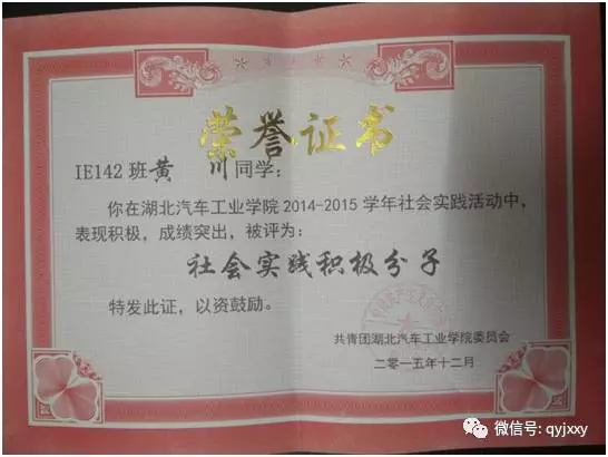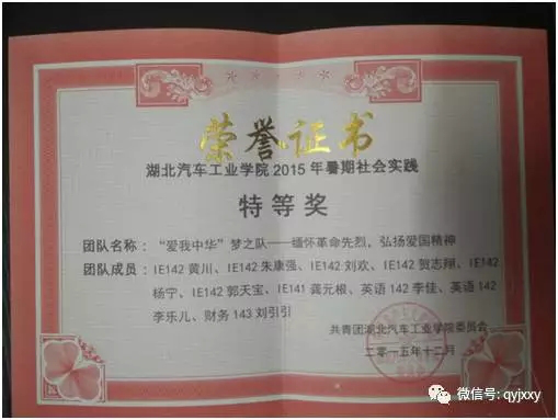 2015年5月,应学校开展2015暑期课外实践活动的要求,他组建了“爱我中华”梦之队,并大力宣传、积极组织班上同学参加此社会实践活动,使得班级同学的参与率达100%。活动期间,他带领实践团队的队员们积极实践,取得了丰厚的活动成果。寻访十堰抗战老兵活动受到媒体的广泛关注,十堰晚报报道2次,各类国家级、省级市级等主流网站对我们的媒体报道达1500余篇。在我校逸夫图书馆成功举办了“寻访十堰抗战老兵主题展”。“爱我中华”梦之队先后获得2015年机械工程学院暑期课外实践特等奖,2015年太阳成城集团tyc234cc暑期课外实践特等奖,2015年湖北省社会实践优秀团队,团中央学校部和中青网联合举办的镜头中的三下乡“好团队”奖。个人获得“2015年太阳成城集团tyc234cc社会实践积极分子”,“2015年湖北省社会实践先进个人”等荣誉称号。
