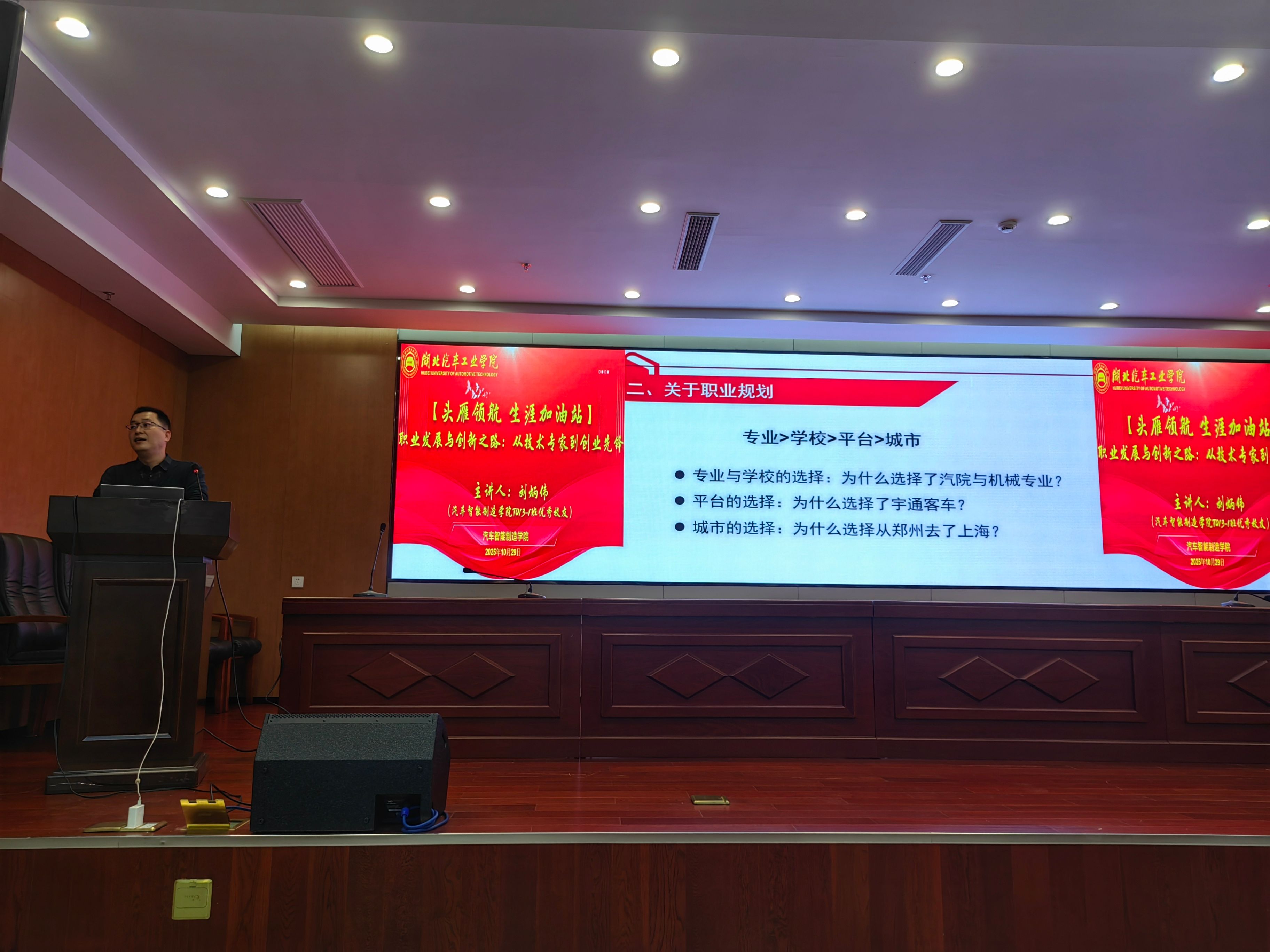 讲座现场,刘炳伟以“职业发展与创新之路:从技术专家到创业先锋 ”为题分享行业前沿与创业心得,他结合自身在宇通客车股份有限公司深耕十七载,从半成品工艺师逐步成长为工艺部副部长的职业经历,拓展同学们对专业前景的认知边界,并重点介绍其带领团队斩获国家科技进步二等奖的突破性项目案例,鼓励同学们在未来的职业生涯中保持求知、坚定热爱、勇于创新。他强调技术突破来源于“寻找好平台、学到真东西、发现真问题、认识行业顶尖人才、持续深耕反复探究”。在互动环节,刘炳伟耐心解答,并分享了宝贵的实践经验。他特别指出,“在困难时刻,汽院艰苦奋斗、自强不息的精神总是激励着我”。他鼓励学弟学妹们要扎实学好专业知识,尽早培养主动探索与解决问题的能力,在热爱中找准方向,勇于拥抱技术变革,敢于挑战未知领域,将个人成长融入国家制造业升级的大潮中。