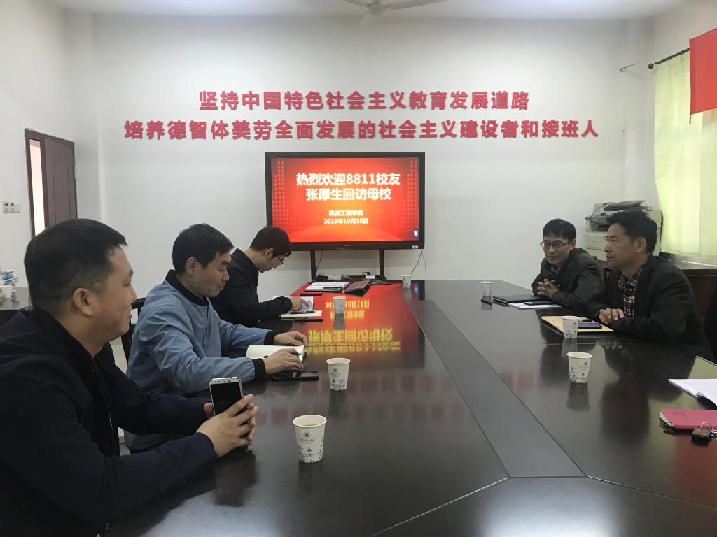 10月18日下午14:00,机械工程学院T88级校友——华泰汽车副总裁张厚生回访母校,机械工程学院分党委书记宫爱红、分党委副书记陈雪刚,原机械工程系系主任常治斌教授,学工办主任唐小燕以及专业课教师孙国兴、龚青山、宋俊在机械大院206会议室与校友进行了座谈交流。