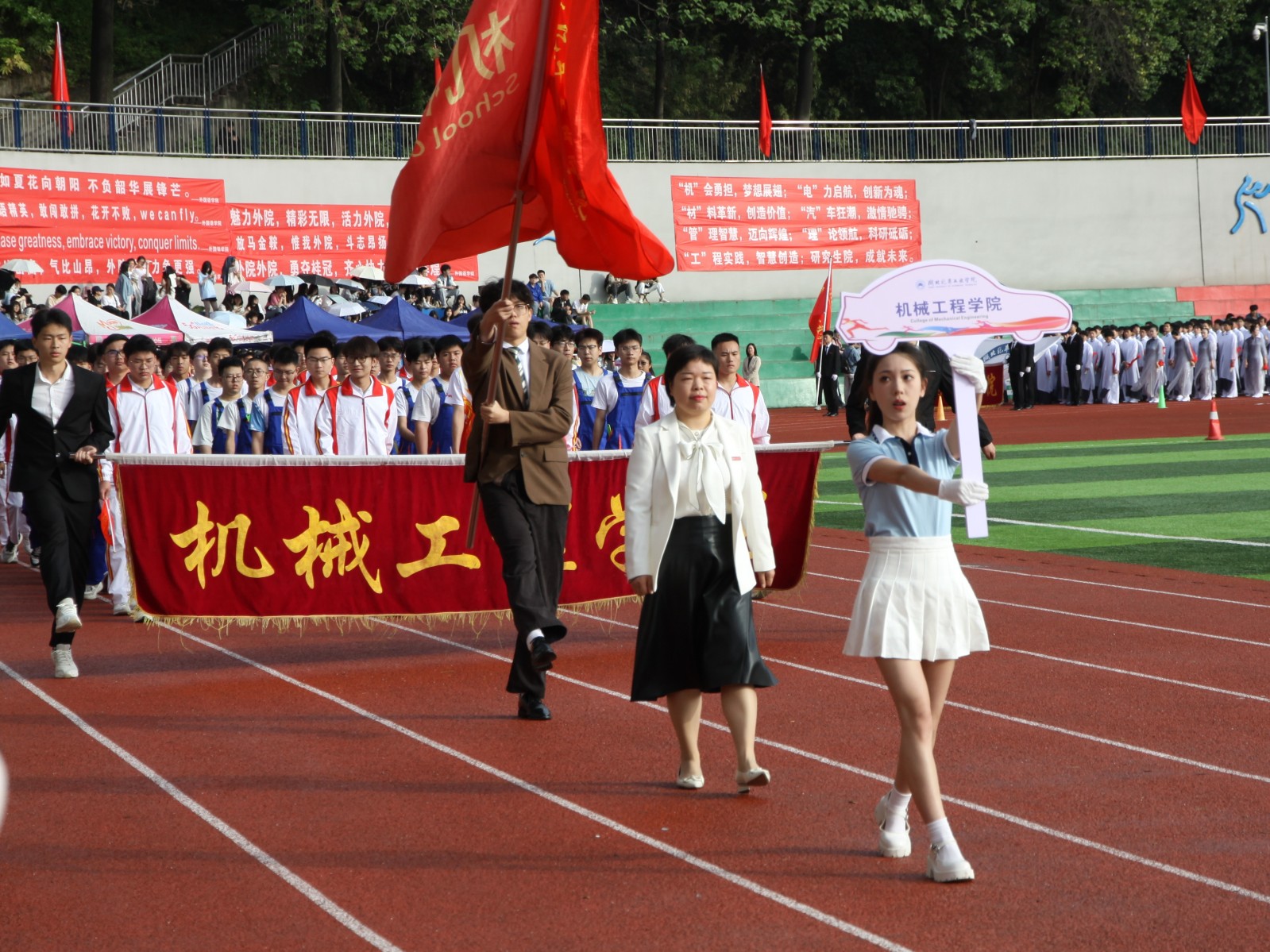 开幕式上,伴随着激昂的《运动员进行曲》,由我院分党委书记崔海英带领方阵踏着整齐的步伐走过主席台,师生代表们昂首挺胸,充满朝气,高呼“敢拼敢赢,机械先行,追光而遇,沐光而行”口号。在方阵的精彩表演中同学们个个衣着整齐,面带笑容,向全校师生献上了精彩纷呈的团体演出,展示出机械工程学院学子的青春风采。