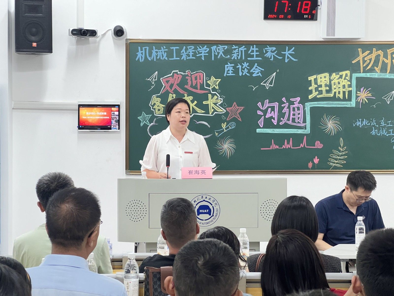 崔海英在致辞中对各位同学顺利通过高考、步入大学表示祝贺,对大家选择汽院、选择机械工程学院表示欢迎,同时提出三点希望:一是同学们要尽快适应个人发展成长的重要转折期,树立终身学习、自主学习的观念,学得真本事、练得硬本领;二是家长们要密切关注孩子价值观念的重要培养期,引导孩子们培育良好的价值观,积极与校方沟通,共同保障孩子们的成长道路不脱轨、不偏航;三是大家要牢牢把握学校跨越发展的重要机遇期,家校生三方协同,将机遇转化成为促动学生成长进步的动力。