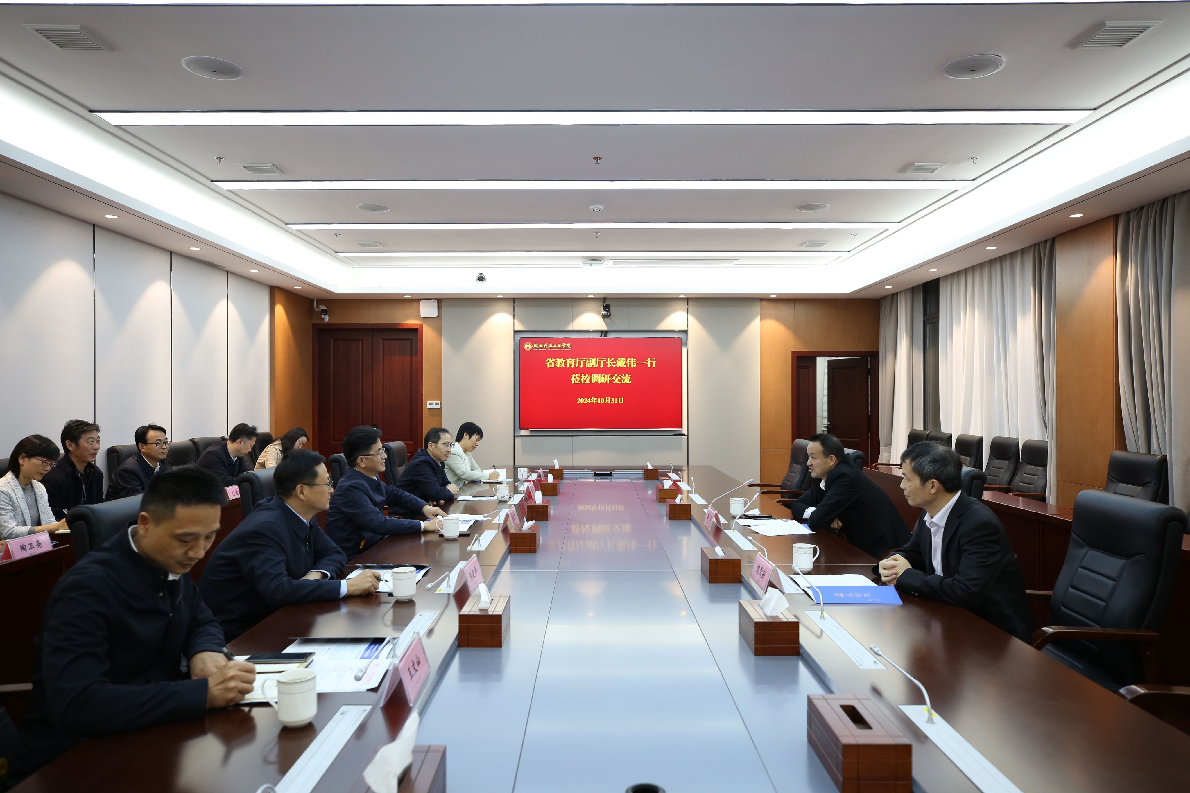 本网讯(文 潘佳欣/图 李一凡)10月31日下午,湖北省教育厅党组成员、副厅长戴伟,湖北省教育厅高等教育处副处长饶贵安一行莅临学校调研指导工作。学校党委书记张文学,党委副书记李涛,党委副书记、纪委书记、监察专员陈建平,党委常委、副校长张红霞,党委常委、党政办主任王文山陪同调研,并在产教大楼三楼多功能会议室召开座谈会。