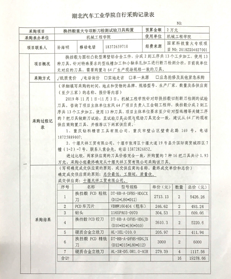 【公示】换挡毂重大专项断刀检测试验刀具购置