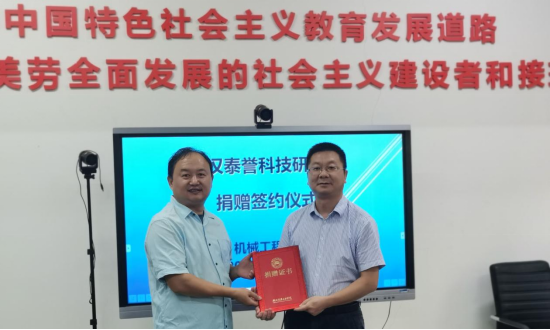 8月22日下午举办武汉泰誉科技研究院捐赠仪式,地点在机械工程学院206会议室。发展规划处副处长陈雪刚、机械学院副院长陈君宝、机械学院部分老师代表参加捐赠仪式,仪式由陈君宝主持。