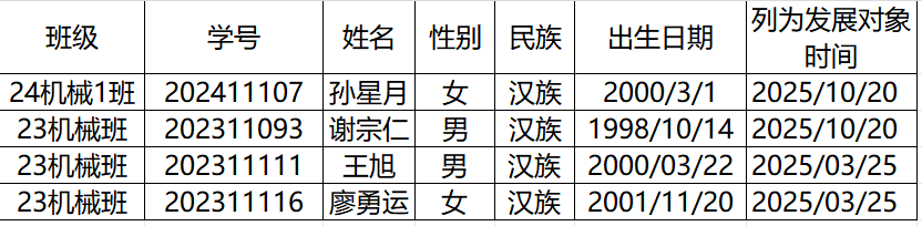 根据《中国共产党发展党员工作细则》(中办发〔2014〕33号)文件精神,按照学校党员发展工作的具体要求,现将我院2025年11月拟发展学生预备党员预审情况予以公示,具体名单如下: