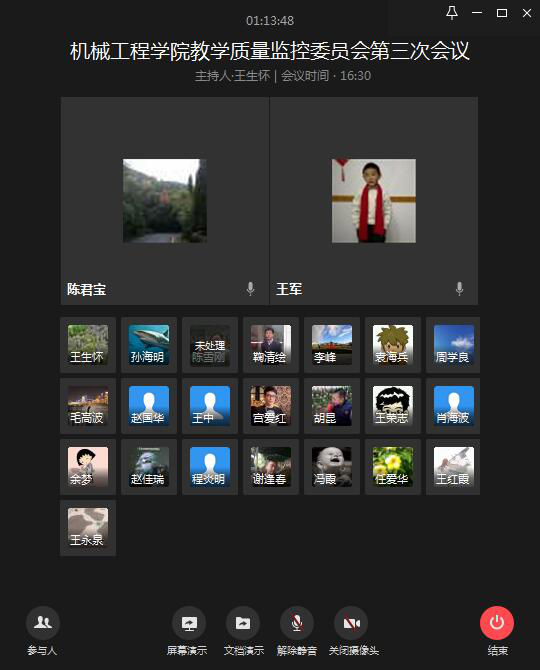 5月11日下午,机械工程学院通过企业微信,召开了本学期第三次教学质量监控委员会工作研讨会。校级督导毛高波受邀参会,学院全体质量监控委员会成员、教学科研办公室人员参加了此次会议,会议由教学副院长周学良主持。