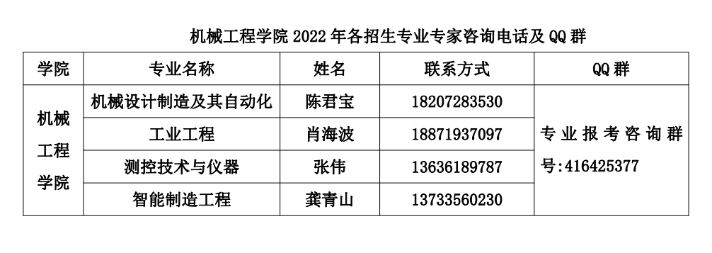 机械工程学院2022年各招生专业专家咨询电话及QQ群