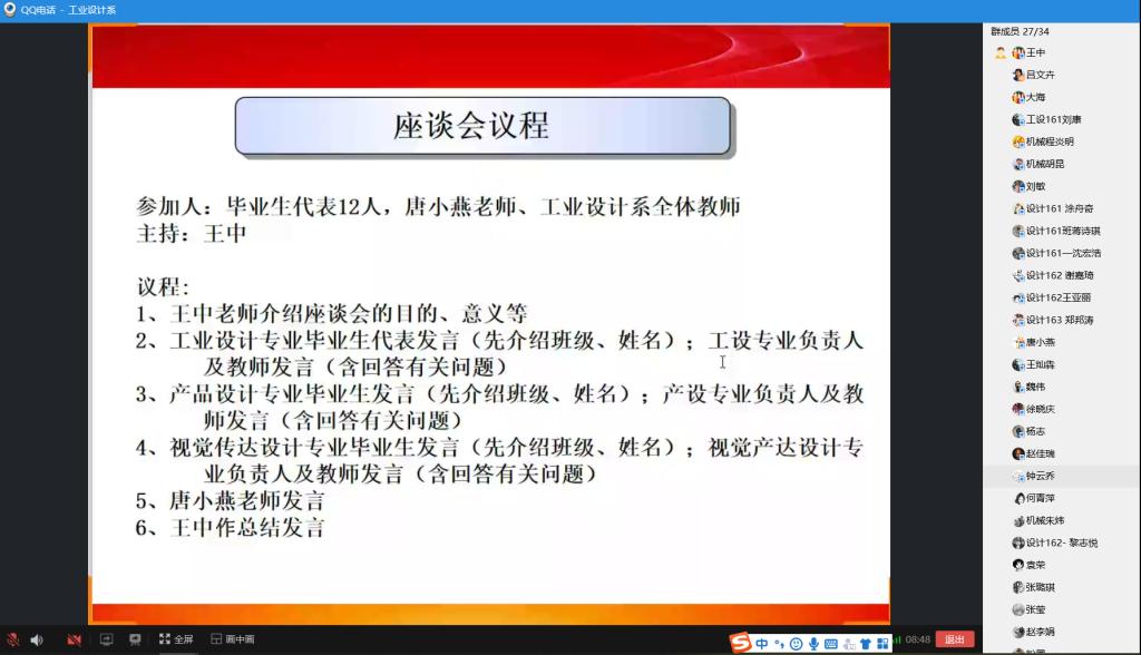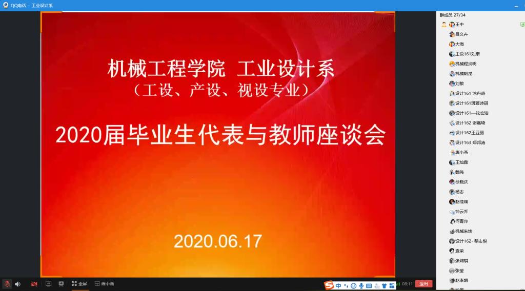 6月17日晚上19:30,为加强教师与毕业生间的交流,关注学生的学习和生活,广泛听取毕业生在校期间关于学习、生活、创新创业就业等方面的体会、意见和建议,落实“学生中心、产出导向、持续改进”的核心理念,机械工程学院工业设计系通过QQ群语音方式组织召开了线上师生座谈交流会。会议由系主任王中老师主持,学院学工办主任唐小燕老师、工业设计系全体教师及工业设计、产品设计、视觉传达设计三个专业的12名毕业生代表参加。