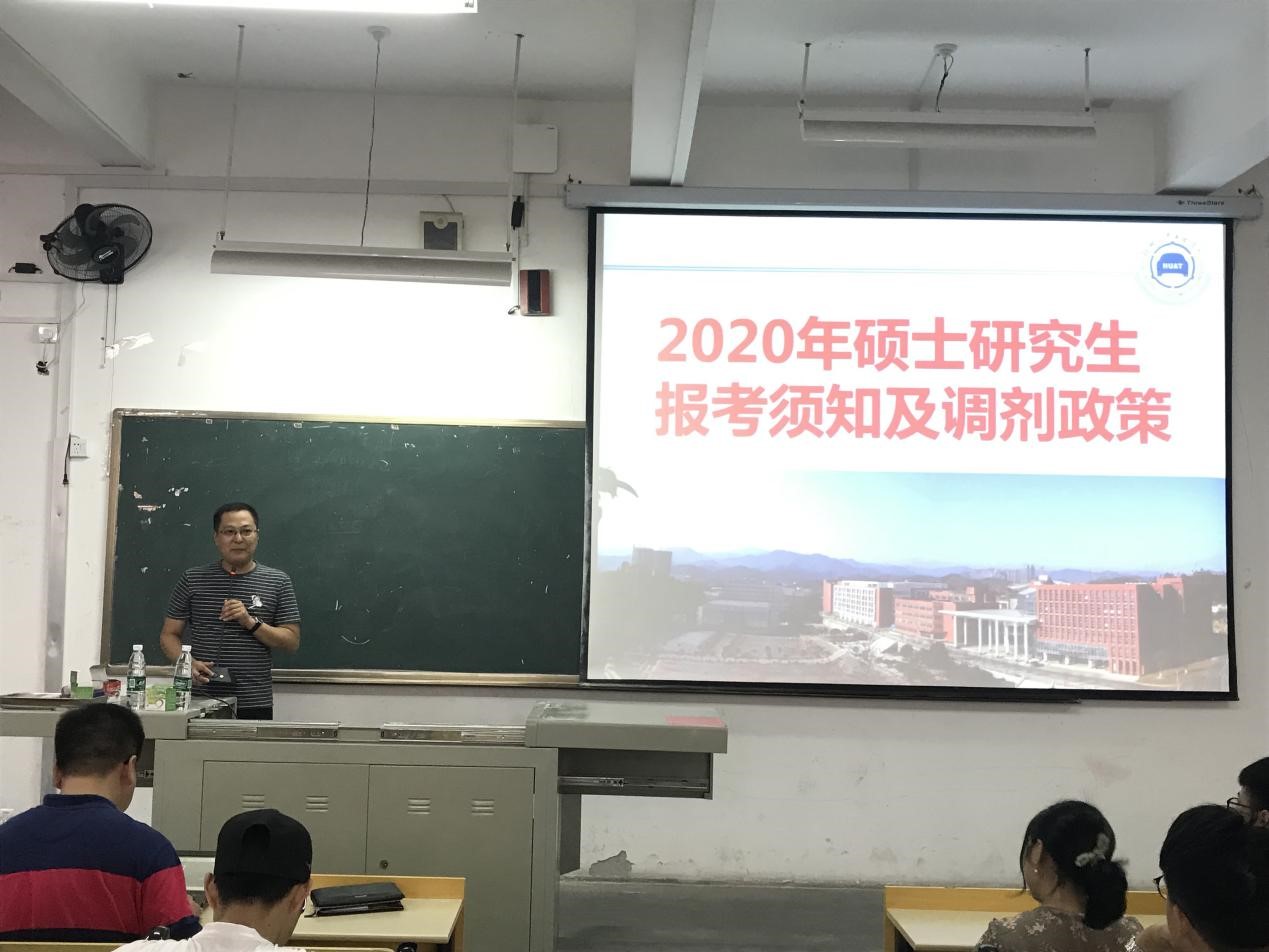 会上,杜祥军结合2020年硕士研究生的报考须知及调剂政策就如何选择考点、如何网络报名缴费等考研中的常见问题进行了细致的讲解,鼓励同学们坚定考研信心,调整心态,积极备考。杜老师还详细介绍了我校师资情况、研究生教育特色、研究生奖助学金体系以及近年研究生招生情况,希望同学们权衡态势、结合自身、准确定位、早做打算,理性选择报考学校,并诚挚欢迎同学们积极报考本校继续深造。