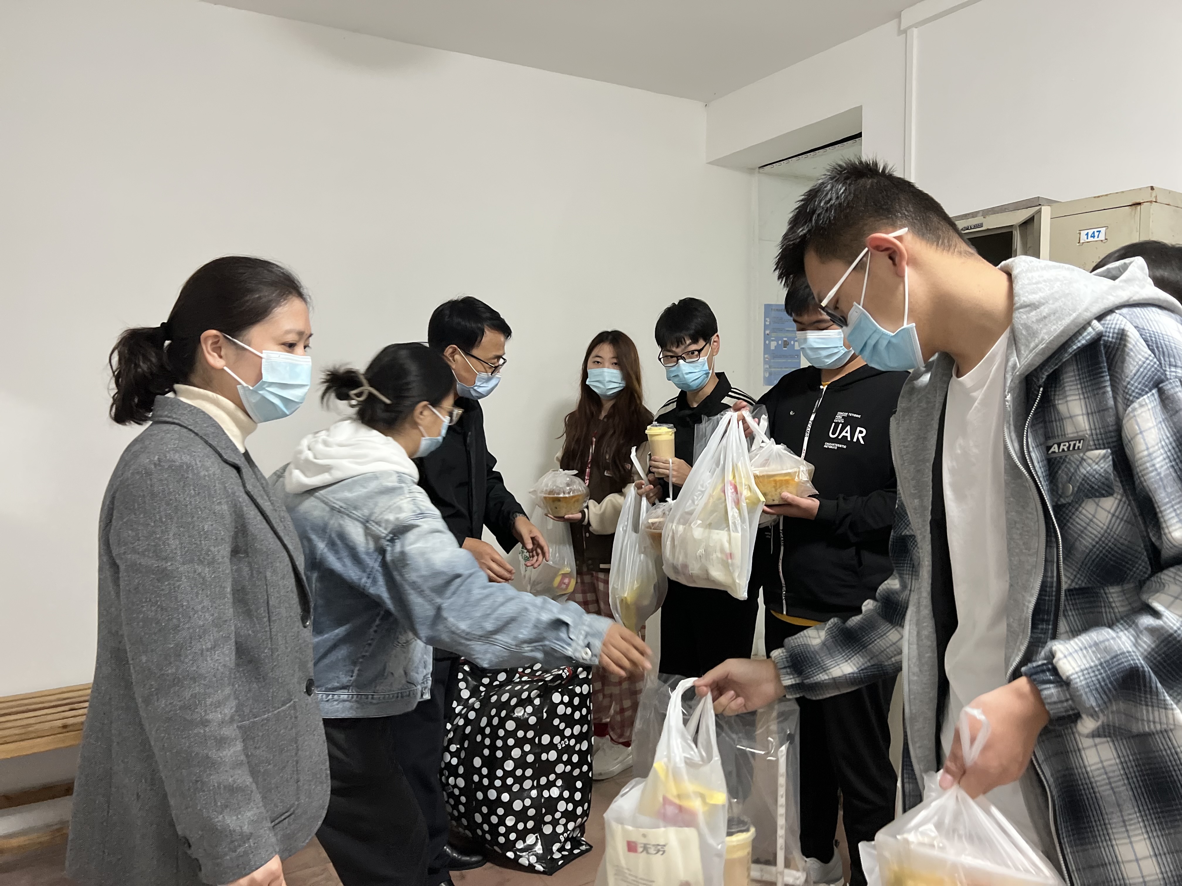 将防寒被褥、爱心“烫饭”、温暖奶茶和零食礼包送到学生手上后,学院领导详细询问了居家健康检测的2022级新生学习、生活各方面的情况,嘱托在虹枫公寓居家健康检测的全部学生务必要严格遵守学校防疫政策要求,注意防寒保暖和身体健康,同时要保持良好的生活、学习习惯,积极坚持线上学习、努力跟上班级学习进度,要求同学们有困难务必要和我们学院辅导员老师联系。