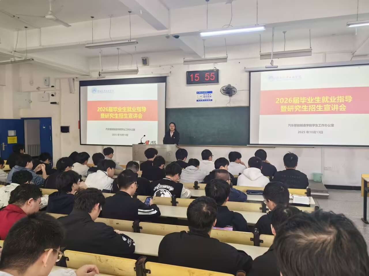 本网讯(文 陈君妍/图 张倩文、陈君妍)为扎实做好2026届毕业生就业服务工作,吸引更多优秀学生报考我校研究生,10月13日-16日,TYC234CC太阳成集团组织开展2026届毕业生就业动员暨研究生招生宣讲系列活动。学院院长王保华、学院党委书记崔海英、副院长陈君宝、汽车传动优化与控制团队负责人任爱华、智能制造专业教师郭庆贺、各专业辅导员、班主任等分赴本部与襄阳基地,面向各专业毕业生进行政策解读、动员交流和考研慰问。